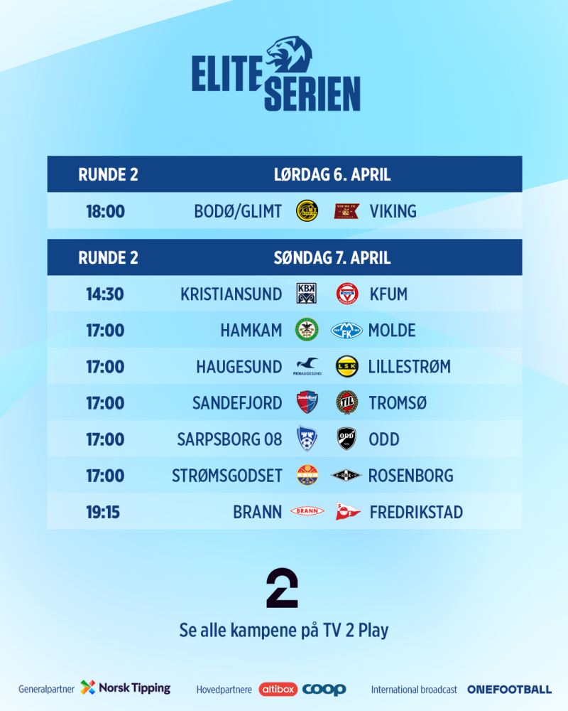 | 19 | 17.8-18.8 | Lørdag - Søndag | Bodø/Glimt | Sandefjord |