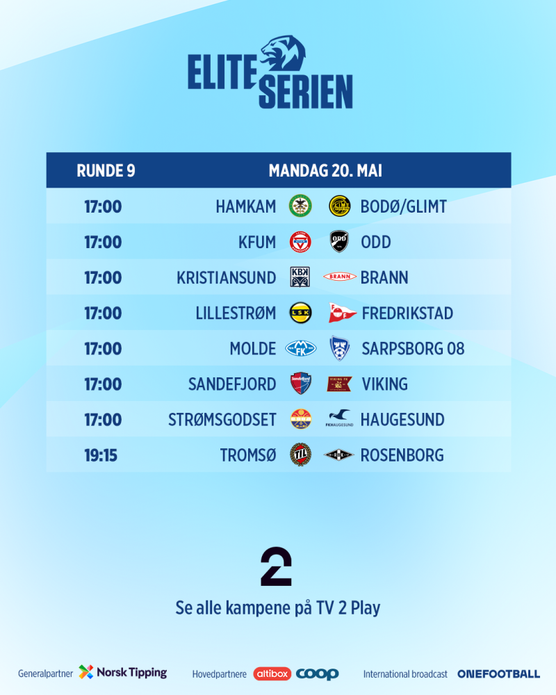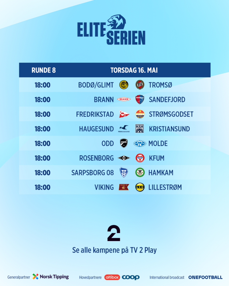 | Bodø/Glimt | - | Tromsø | 16.mai | 18.00 |